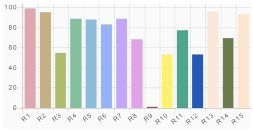 Como muestra el gráfico a continuación, una fuente de luz puede funcionar bastante bien con las primeras 8 muestras de color de prueba, con una buena puntuación entre R1 y R8. Para la métrica general CRI Ra, esto significa que un LED con una reproducción deficiente del color rojo puede funcionar con una calificación CRI (Ra) de 80.