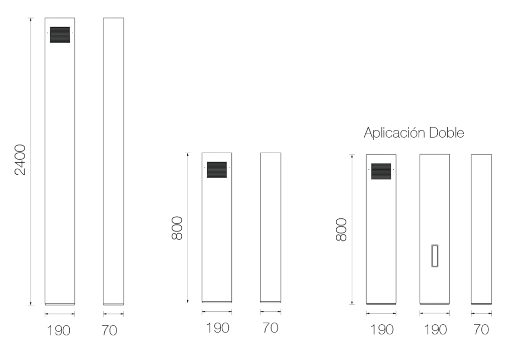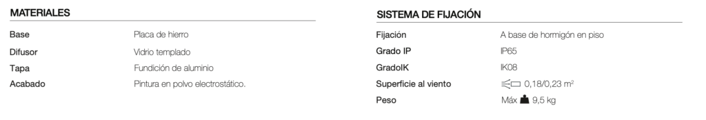 Luminaria de diseño moderno, en dos alturas, adecuada para aplicaciones de alumbrado en parques y espacios públicos. Ideal para delinear senderos y bicisendas. Luminaria hecha de perfiles de aluminio, aleación de aluminio y acero inoxidable. Conjutno óptico en la parte superior, IP65 , con leds alta potencia y lentes. Anclaje de luminaria con columna embutida en piso. Cuerpo inferior de la luminaria con puerta de inspección insertadas de aluminio inyectado y pestillo en la misma. Clasificacion de la Luminaria: clase de protección IP 65.