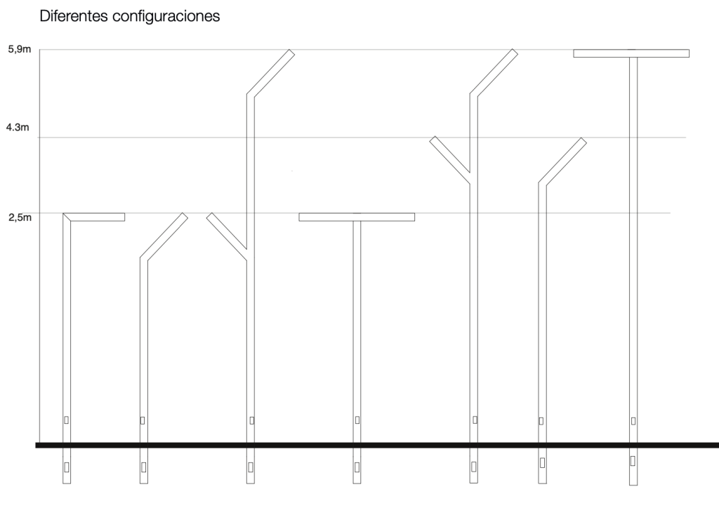 Farola Urbana de lineas puras para instalar en forma individual o grupal «tipo ramillete», permite lograr configuraciones creativas y de impronta unica que proyecten difertentes efectos luminicos y puntos focales.