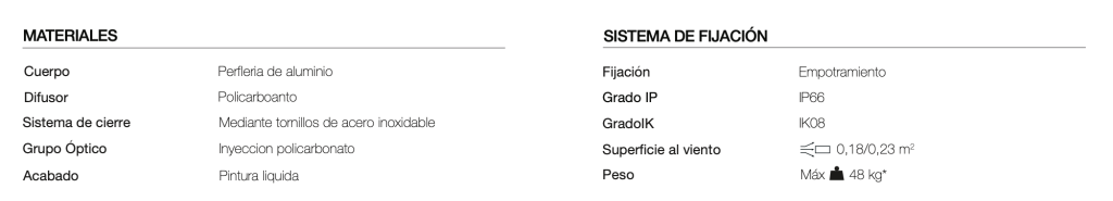 Luminaria de diseño moderno, adecuada para aplicaciones de alumbrado en parques, costaneras, paseos urbanos tanto públicos como privados. Cuerpo en perfileria de hierro acabado con pintura epoxi. Difusor PMMA. Grado de estanqueidad IP66 e IK08.