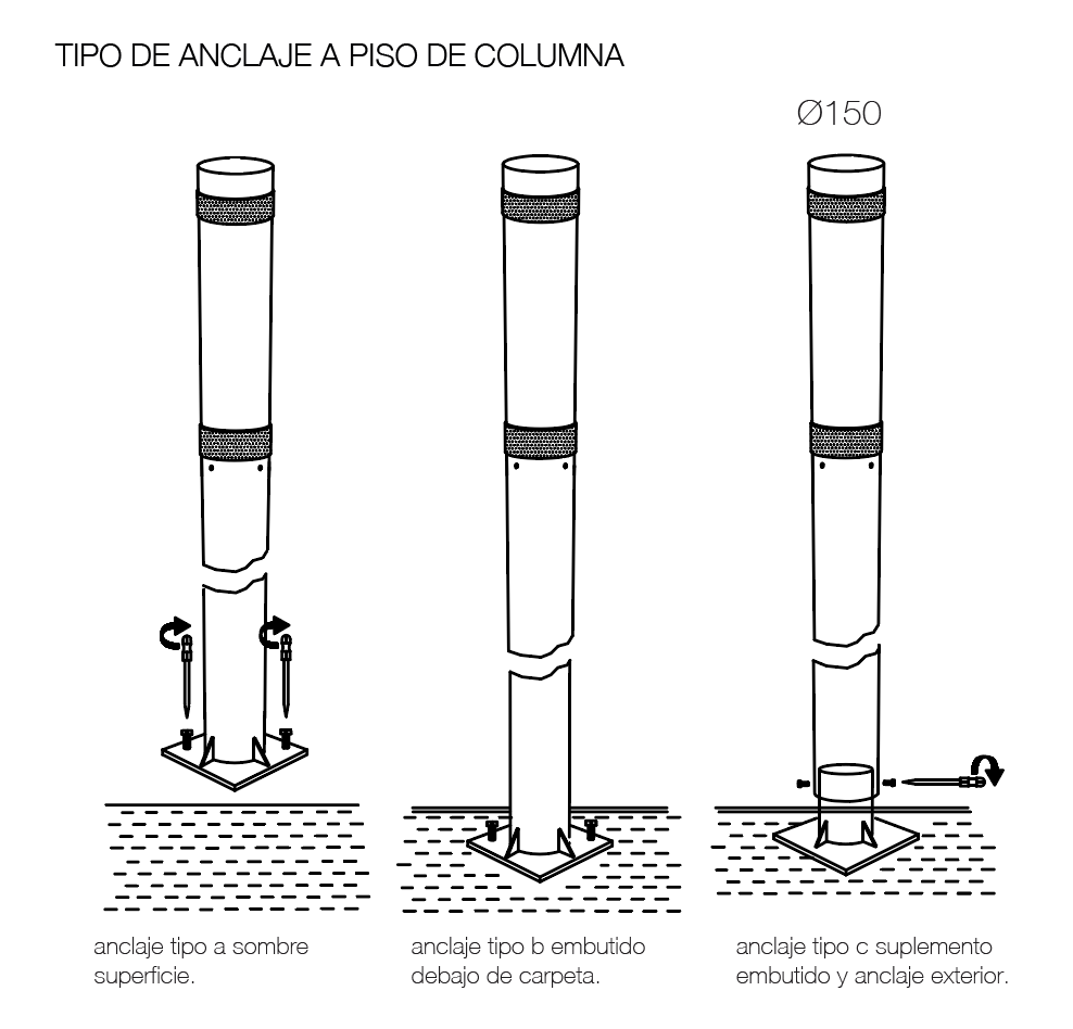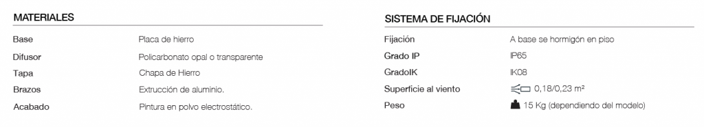 Luminaria de diseño moderno, adecuada para aplicaciones de alumbrado en parques y espacios públicos. Ideal para delinear senderos y bicisendas. Diametro del caño de 150 mm. Luminaria hecha de aleación de aluminio o acero inoxidable. Conjunto óptico en la parte superior, IP65 , con leds alta potencia y lentes. Anclaje de luminaria con columna embutida en piso. Cuerpo inferior de la luminaria con puerta de inspección insertadas de aluminio inyectado y pestillo en la misma