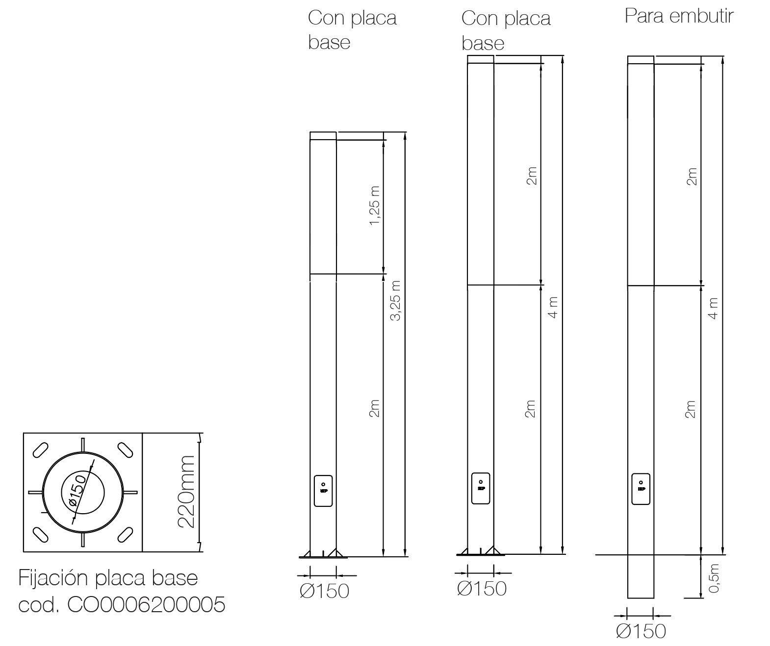 Luminaria de diseño moderno, adecuada para aplicaciones de alumbrado en parques y espacios públicos. Ideal para delinear senderos y bicisendas. Diametro del caño de 150 mm. Luminaria hecha de aleación de aluminio o acero inoxidable. Conjunto óptico en la parte superior, IP65 , con leds alta potencia y lentes. Anclaje de luminaria con columna embutida en piso. Cuerpo inferior de la luminaria con puerta de inspección insertadas de aluminio inyectado y pestillo en la misma