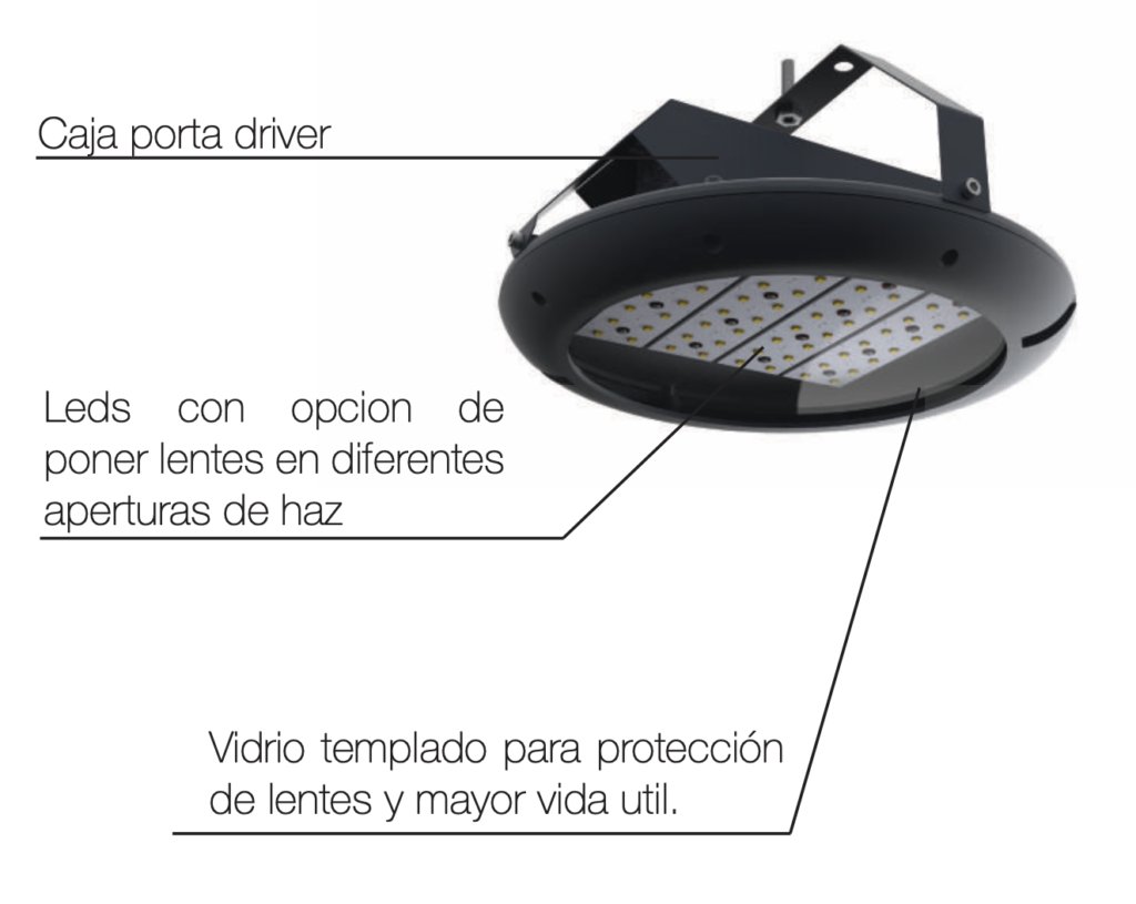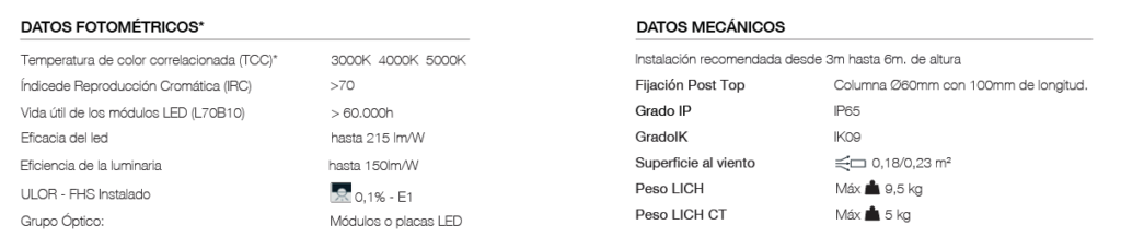 Lich, luminaria urbana con iluminación general difusa. Con fijación superior mediante lira. Luminaria de clase I, materializado en fundición de aluminio, cuenta cono reflector recuperador de flujo y soporte para el grupo óptico de LED con tapa semicurva y difusor de policarbonato transparente. Diseñada para aplicación en parque, sendas peatonales, zonas comerciales. La luminaria Catenaria en fundición de aluminio cuenta con driver estanco IP66 apto intemperie, la tulipa contiene prismas en el material, para mejorar la dispersión del haz lumínico ya que por lo general los cables de sujeción son a baja altura.