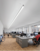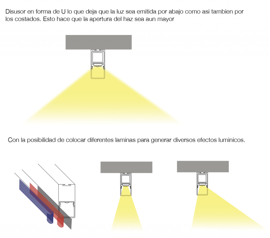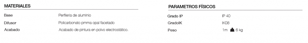 Luminaria lineal de LED para instalación en techo, aplicado o suspendido. Cuerpo de aluminio extruido pintado, disponible con diferentes longitudes y disposiciones. Difusor en policarbonato facetado. Alimentación integrada y equipado con conectores para garantizar la continuidad de la alimentación.