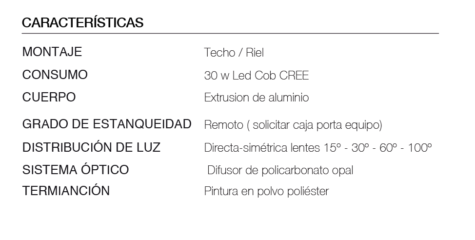 Luminaria tipo proyector de interior para colocar en techo – pared o para adosar a riel con sus accesorios. Luminaria minimalista, cuerpo en aluminio prensado y disipador a la vista. Lentes de ópticas intercambiables